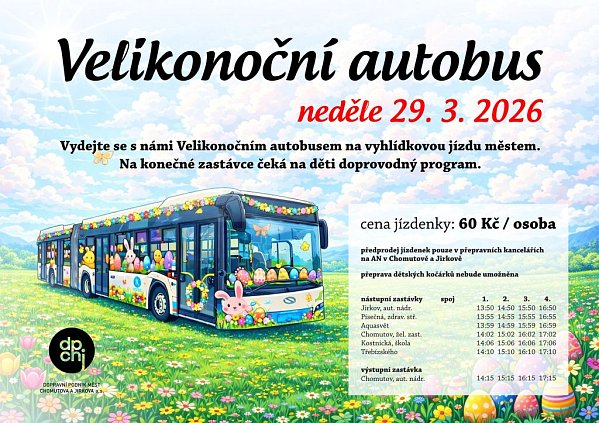 29. března v 13:50 hodin vyjede Velikonoční autobus Dopravního podniku Chomutov a Jirkov. Speciální spoj nabídne slavnostní jízdu spojenou s velikonoční atmosférou a doprovodným programem.