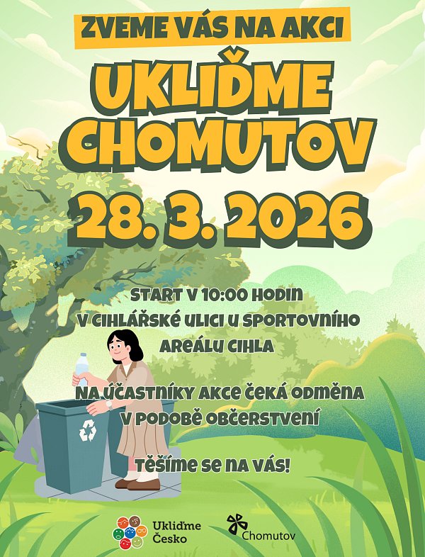 Ukliďme Chomutov 2026 28. března od 10:00 hodin se v okolí Cihlářské ulice (start u sportovního areálu Cihla) uskuteční akce Ukliďme Česko 2026 – Ukli...